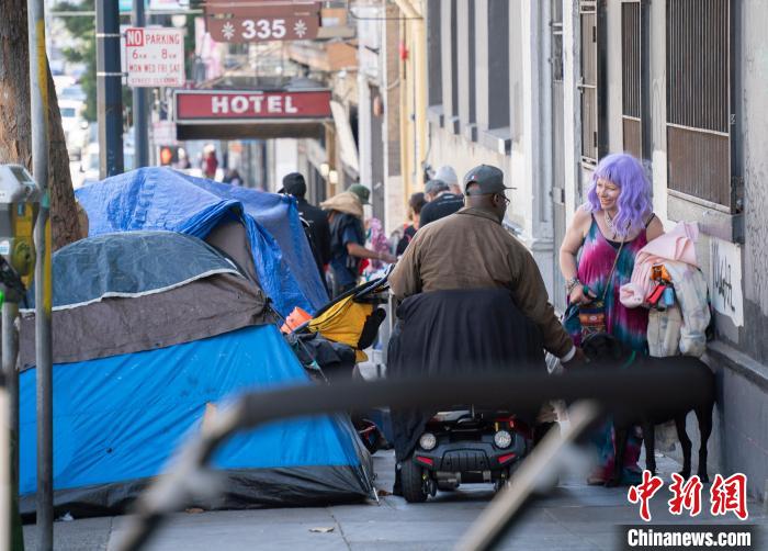 當(dāng)?shù)貢r(shí)間8月18日,無(wú)家可歸者從美國(guó)舊金山田德隆區(qū)街頭經(jīng)過(guò)。中新社記者 劉關(guān)關(guān) 攝