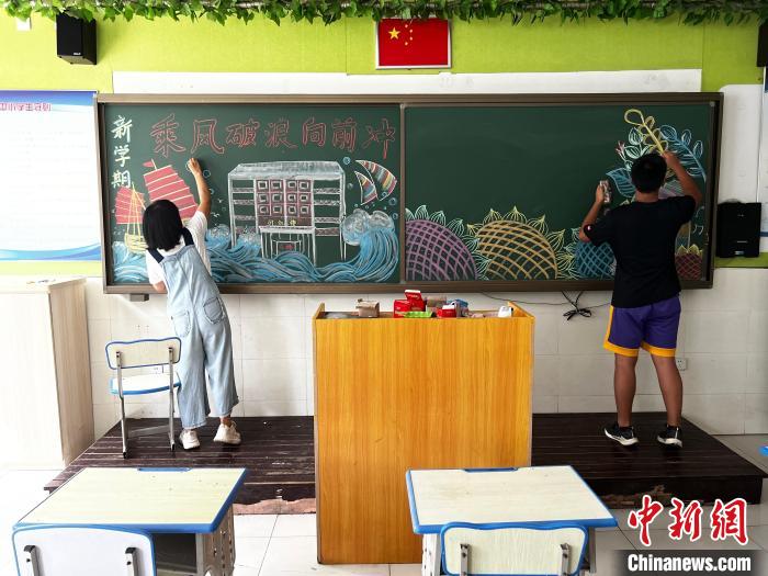 在一間教室里,來自夏村中學(xué)的教師丁玲正帶著學(xué)生徐俊熙繪制迎接新生的黑板報,有大船、海浪、向日葵等圖案。徐俊熙開學(xué)上初二,他對記者說:“這個黑板報的主題‘乘風(fēng)破浪向前沖’,是為了激勵同學(xué)們要堅強起來,不畏困難,積極向上。”