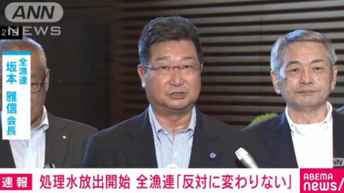 當(dāng)?shù)貢r(shí)間24日下午,針對(duì)福島核污染水被正式排入大海,日本全國(guó)漁業(yè)協(xié)會(huì)聯(lián)合會(huì)(全漁聯(lián))表示:“反對(duì)核污染水排海的立場(chǎng),沒有絲毫改變”。圖片來源:日本朝日電視臺(tái)視頻截圖