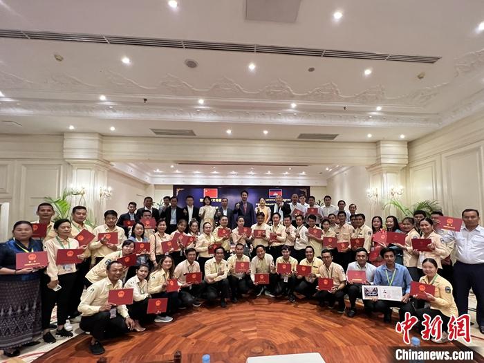 8月21日至30日,柬埔寨中文導游海外培訓班在暹粒舉行,來自金邊和暹粒兩地的60名中文導游及旅游從業(yè)者參加培訓學習。圖為8月30日,柬埔寨中文導游海外培訓班結(jié)業(yè)典禮。 中新社發(fā) 項目團隊供圖