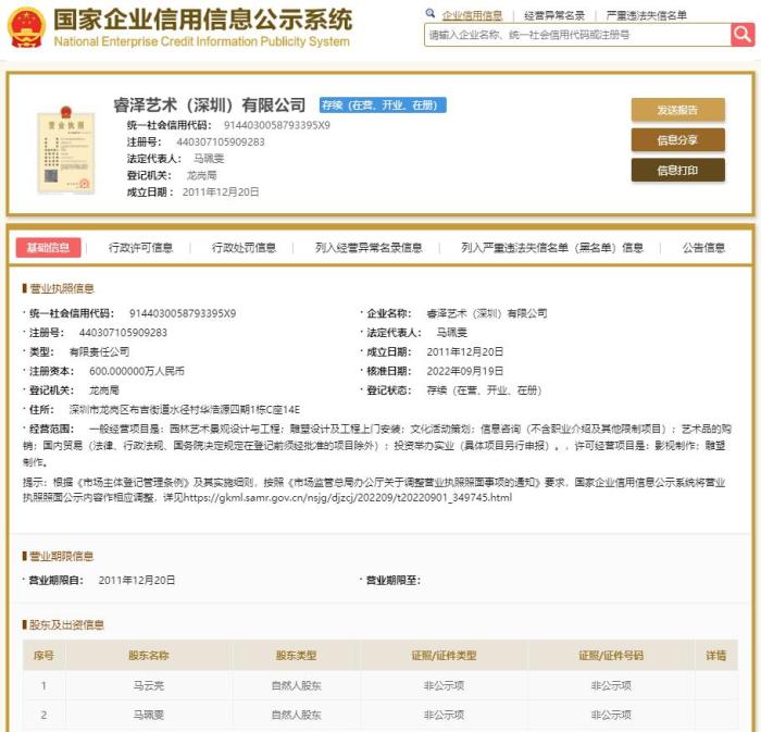 國(guó)家企業(yè)信用信息公示系統(tǒng)顯示,睿澤藝術(shù)(深圳)有限公司成立于2011年12月,法定代表人為馬珮雯,注冊(cè)資本600萬(wàn)人民幣。公司由馬云亮、馬珮雯共同持股,馬云亮持股75%,為公司實(shí)控人。