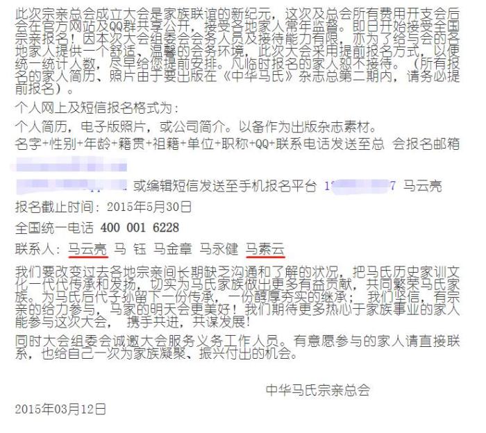 此外,前述“馬氏宗親大會(huì)”還包括一位名叫馬素云的聯(lián)系人。