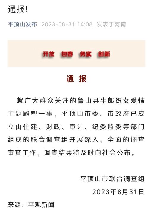 8月31日,“平頂山發(fā)布”公眾號(hào)發(fā)布通報(bào),就廣大群眾關(guān)注的魯山縣牛郎織女愛(ài)情主題雕塑一事,平頂山市委、市政府已成立由住建、財(cái)政、審計(jì)、紀(jì)委監(jiān)委等部門組成的聯(lián)合調(diào)查組開(kāi)展深入、全面的調(diào)查審查工作,調(diào)查結(jié)果將及時(shí)向社會(huì)公布。