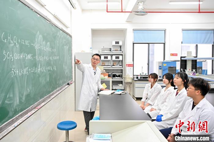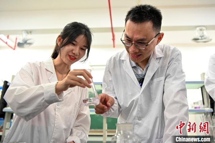 今年6月底,臺灣教師黃崇輔(右)在肇慶學院指導(dǎo)學生做實驗。中新社記者 陳驥旻 攝