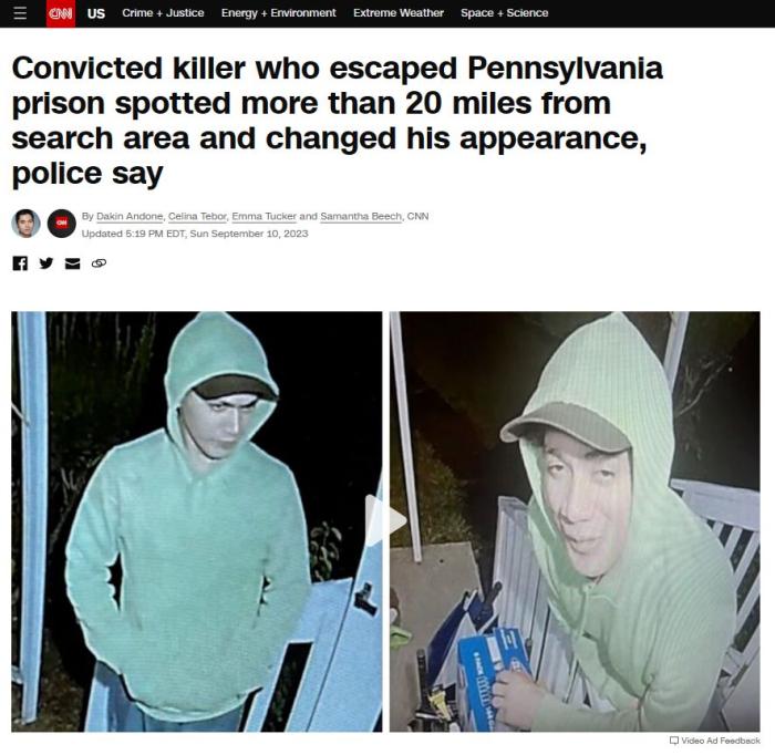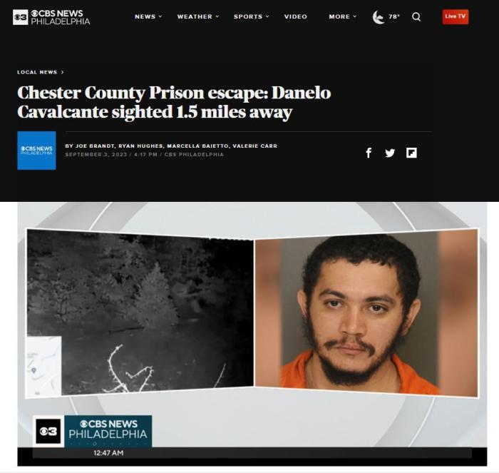 據(jù)報道,當(dāng)?shù)貢r間8月31日上午8時45分左右,卡瓦爾坎特從賓夕法尼亞州切斯特縣監(jiān)獄越獄,該地距離費(fèi)城約有1小時車程。自其越獄后,已多次被監(jiān)控拍到,也有目擊者見到過他。