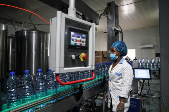 9月9日,當(dāng)?shù)貑T工在位于加蓬首都利伯維爾的歐來源純凈水廠生產(chǎn)線上工作。新華社記者韓旭攝