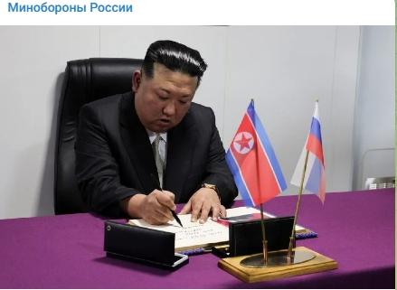 當(dāng)?shù)貢r(shí)間16日,金正恩在俄“沙波什尼科夫元帥”號(hào)護(hù)衛(wèi)艦貴賓簿上留言。圖片來源:俄國防部社交媒體截圖