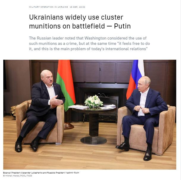 中新網(wǎng)9月15日電 據(jù)塔斯社報(bào)道,當(dāng)?shù)貢r(shí)間15日,俄羅斯總統(tǒng)普京在索契會(huì)見(jiàn)白俄羅斯總統(tǒng)盧卡申科時(shí)向記者表示,烏克蘭正在廣泛地使用集束彈藥。他還對(duì)為烏克蘭提供集束彈藥的美國(guó)做出評(píng)論。