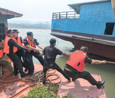 中老執(zhí)法人員在湄公河上對(duì)商船開展聯(lián)合檢查。