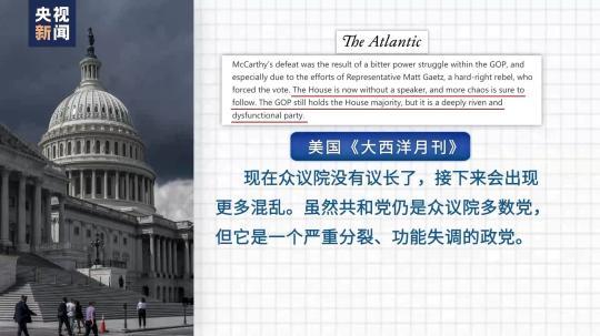 美國《大西洋月刊》評(píng)論說,現(xiàn)在眾議院沒有議長(zhǎng)了,接下來會(huì)出現(xiàn)更多混亂。雖然共和黨仍是眾議院多數(shù)黨,但它是一個(gè)嚴(yán)重分裂、功能失調(diào)的政黨。