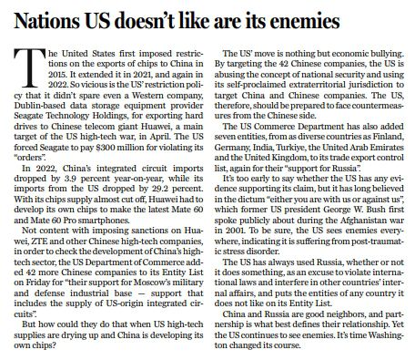 美國的這一做法,是徹頭徹尾的“經(jīng)濟霸凌”。本次將42家中國企業(yè)列入“管制清單”,正是美國泛化其所謂“國家安全”概念,動用其所謂“治外法權”,打壓中國及中國企業(yè)的又一實例。這可能會引來中國的反制措施,對此美國應做好準備。