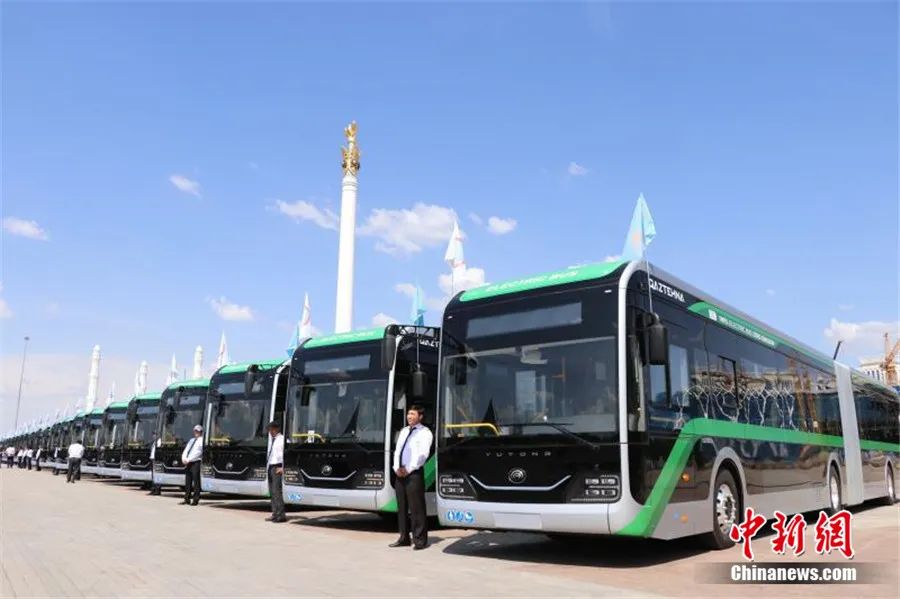 2023年7月4日,來自中國的宇通客車批量交付儀式在哈薩克斯坦首都阿斯塔納獨立廣場舉行。張碩 攝