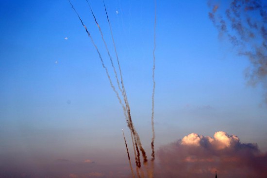 這是10月10日在加沙城拍攝的向以色列發(fā)射的火箭彈。新華社發(fā)(里澤克·阿卜杜勒賈瓦德攝)