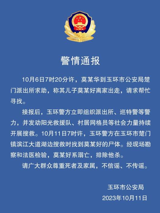 中新網(wǎng)10月11日電 浙江省玉環(huán)市公安局11日在其官方微信發(fā)布警情通報(bào)稱,10月6日7時(shí)20分許,莫某華到玉環(huán)市公安局楚門派出所求助,稱其兒子莫某好離家出走,請(qǐng)求幫忙尋找。