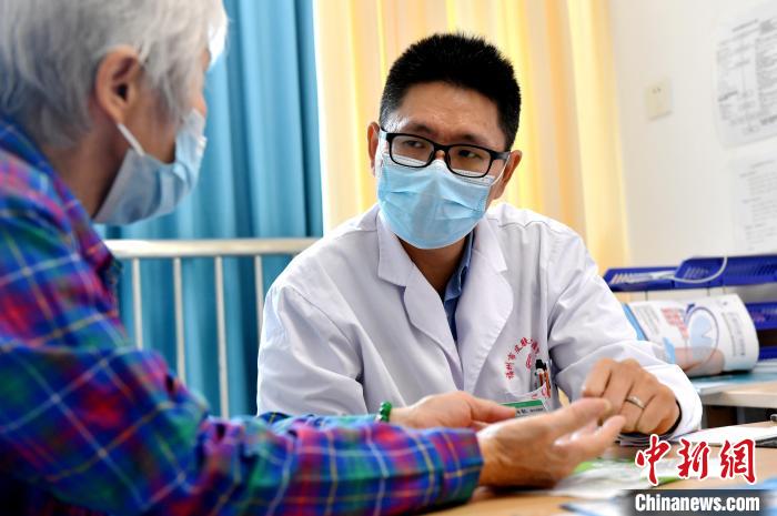 10月9日,現(xiàn)就職于福州市皮膚病防治院的臺籍醫(yī)生陳柏叡在與一名患者交流。 中新社記者 呂明 攝