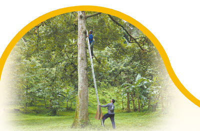威猜站在十幾米高的榴蓮樹上,揮刀砍斷榴蓮與樹杈連接處,幾公斤重的榴蓮落了下來。樹底下,他的同伴緊盯著一個個從天而降的“刺球”,在它們落地前一瞬間,張開麻袋,穩(wěn)穩(wěn)兜住。不一會兒,地上就碼放了一排榴蓮。