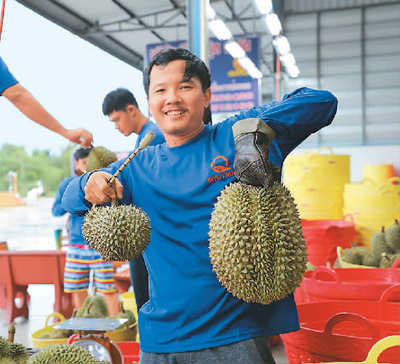 春蓬府位于泰國南部,距離曼谷400多公里,是泰國南部最大的榴蓮種植區(qū)。泰國榴蓮主要種植于東部和南部地區(qū),東部榴蓮上市時(shí)間較早,集中在4月至6月,而南部稍晚,于6月至9月成熟收獲。春蓬府農(nóng)業(yè)局局長素班告訴記者,今年南部榴蓮總產(chǎn)量63萬噸,其中春蓬府約33萬噸。素班說,泰國榴蓮近80%銷往國際市場,中國市場占總出口量90%以上。