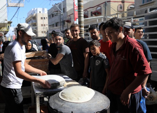 10月15日,在加沙地帶南部地區(qū),流離失所者排隊購買大餅。新華社發(fā)(亞西爾·庫迪攝)