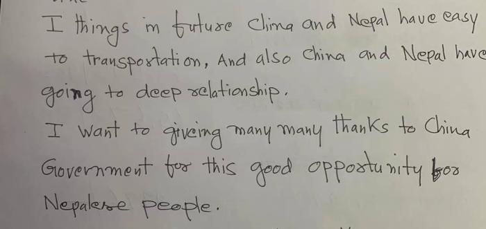國之交在于民相親,民相親在于心相通。采訪過后,這位老人認(rèn)認(rèn)真真地用英文寫下一封信并交給中新網(wǎng)記者。他說:“我相信,未來中尼交通將更加便利,兩國情誼將更加深厚。我非常、非常地感謝中國政府,為尼泊爾人民帶來了這些大好機(jī)會?!?/p>