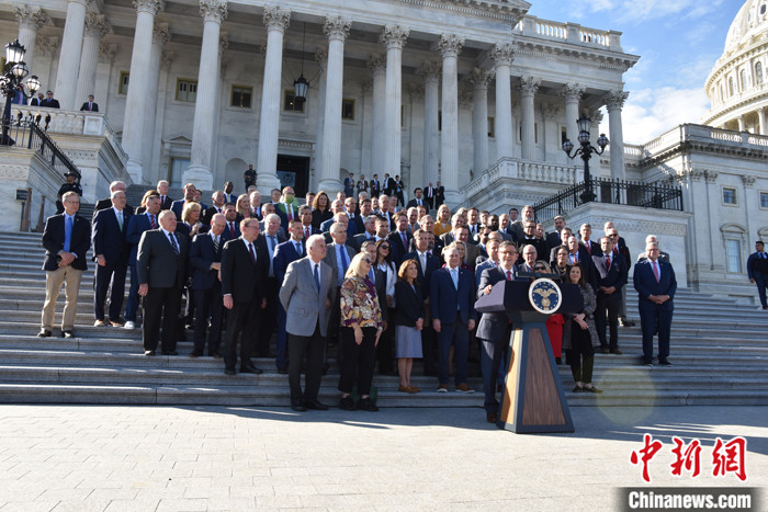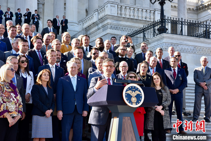 圖為約翰遜當(dāng)選議長后在記者會上表示,過去幾周的議長選舉讓共和黨人“更強大”,“我們將立刻全力以赴開始工作”。 中新社記者 沙晗汀 攝