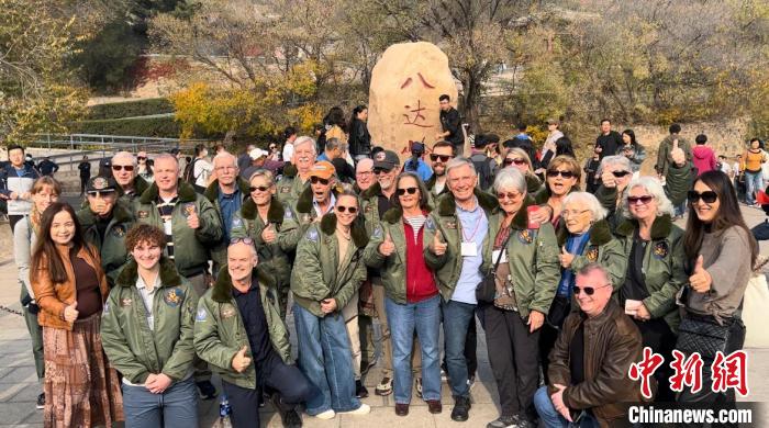 10月29日,美國飛虎隊老兵哈里·莫耶、飛虎隊指揮官陳納德將軍的外孫女尼爾·凱樂威以及一眾飛虎隊老兵家屬在北京八達嶺長城景區(qū)合影留念。中新社記者郭超凱 攝