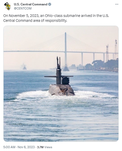 據(jù)報(bào)道,當(dāng)天,美國(guó)中央司令部在社交媒體上發(fā)帖稱,“11月5日,一艘‘俄亥俄’級(jí)戰(zhàn)略潛艇抵達(dá)中東地區(qū)?!?/p>