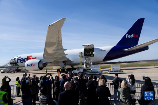 11月8日,運送大熊貓的專機從美國弗吉尼亞州的華盛頓杜勒斯國際機場起飛。新華社記者劉杰攝
