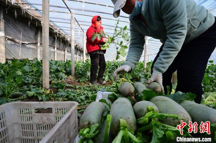 11月11日,天津西青區(qū)辛口鎮(zhèn)小沙窩村,村民在大棚中將采收后的蘿卜裝入筐中。天津市西青區(qū)辛口鎮(zhèn)古時歷經(jīng)多次河水泛濫,大量泥沙及有機物逐步沉積,形成特有的“上沙下粘”土壤條件,造就了沙窩蘿卜脆嫩多汁,口感清爽,味道甘甜。 中新社記者 佟郁 攝