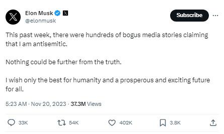 據(jù)報道,馬斯克在社交媒體平臺X上寫道,“過去一周,有數(shù)百個虛假的媒體報道聲稱我是反猶太主義者。事實并非如此。我只希望人類一切都好,所有人都有一個繁榮和令人興奮的未來。”