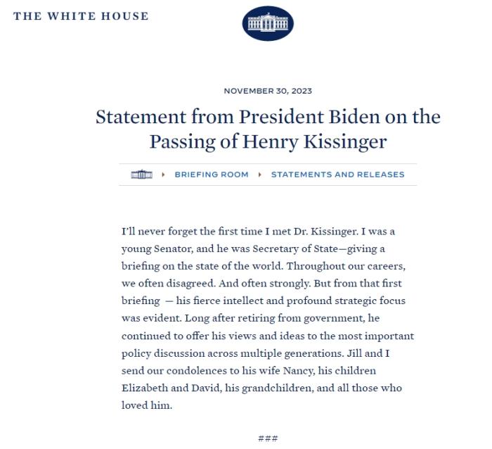 中新網(wǎng)12月1日電 綜合報道,美國前國務(wù)卿基辛格于當(dāng)?shù)貢r間11月29日去世,享年100歲。當(dāng)?shù)貢r間11月30日,美國白宮網(wǎng)站發(fā)布了拜登的哀悼聲明。