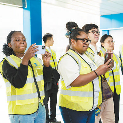 2023“一帶一路”媒體合作論壇聯(lián)合采訪團成員參觀中國建筑長沙機場T3航站樓項目。