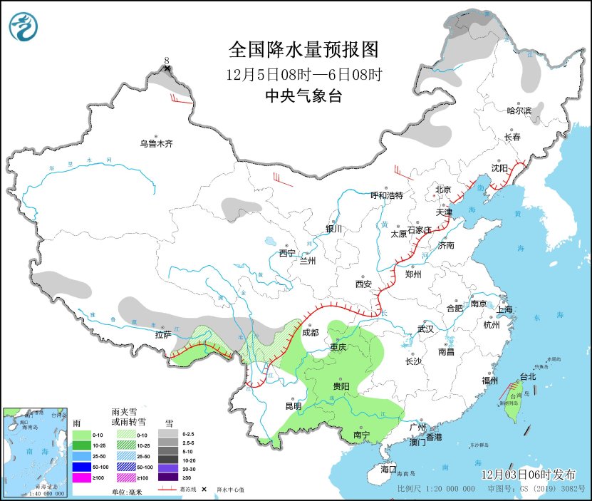 全國降水量預(yù)報(bào)圖(12月5日08時(shí)-6日08時(shí))