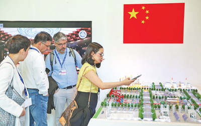 COP28舉辦期間,中國碳捕集利用與封存技術(shù)受到各方關(guān)注。圖為人們在中國角參觀中國首套百萬噸級二氧化碳捕集利用封存項目模型。