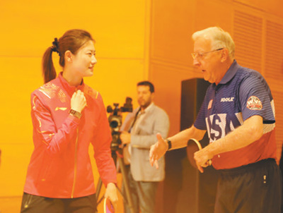 美國(guó)乒乓球名宿戴爾·斯威里斯與中國(guó)乒乓球名將丁寧在交流球技。