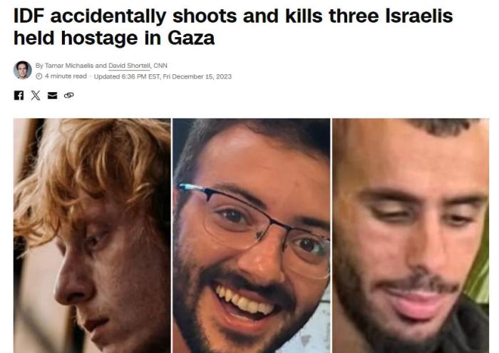 據美國有線電視新聞網(CNN)報道,以色列國防軍發(fā)言人赫格里在新聞發(fā)布會上表示,“在謝賈亞的戰(zhàn)斗中,以色列國防軍錯誤地將三名以方人質視為威脅。軍隊向其開火,他們被打死。”