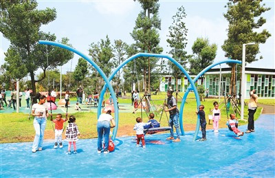 埃塞俄比亞首都亞的斯亞貝巴河岸綠色發(fā)展項目是由中國援助的工程,包括整治城市河道、在河道周邊修建公園和其他公共設施等。圖為當?shù)睾⒆觽冊趤喌乃箒嗀惏秃影毒G色發(fā)展項目的兒童樂園玩耍。