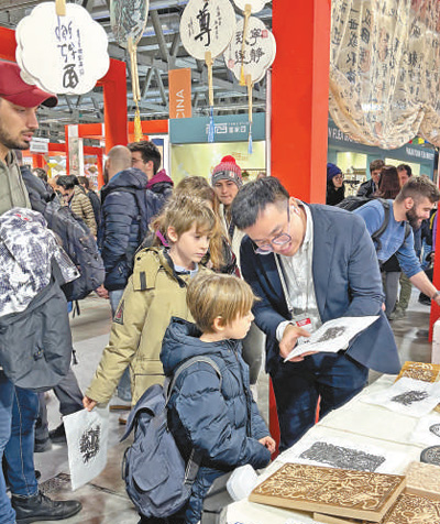 在“漢字文明 太極論道”主題活動(dòng)中,中方工作人員向觀眾介紹了中國(guó)的傳統(tǒng)拓印文化(見圖,劉睿昕攝)。中國(guó)書法家現(xiàn)場(chǎng)寫就的春聯(lián)和福字讓觀眾倍感新奇。太極拳表演、中國(guó)風(fēng)舞蹈、民族樂器演奏等特色節(jié)目也受到現(xiàn)場(chǎng)觀眾的歡迎。