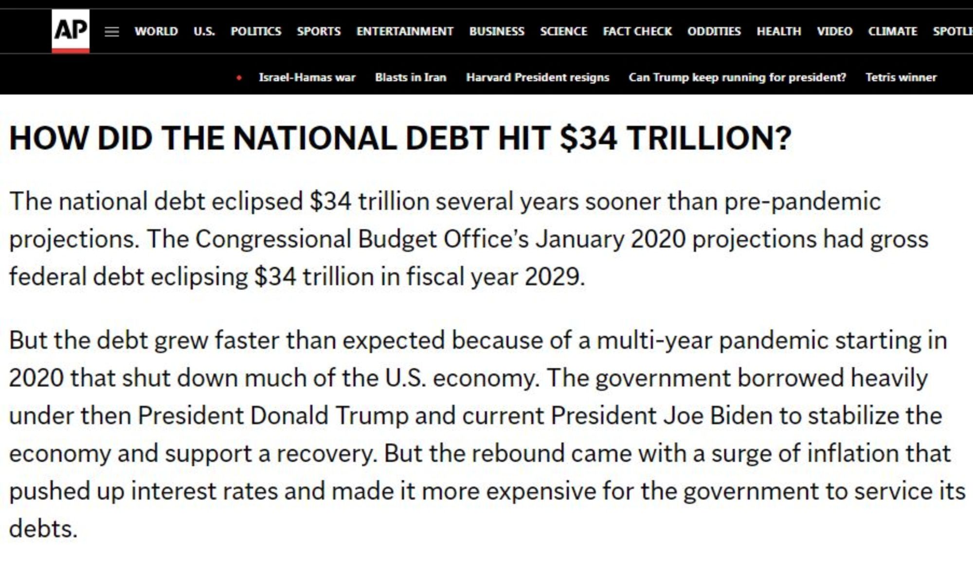 美國(guó)財(cái)政部2日公布的數(shù)據(jù)顯示,美聯(lián)邦債務(wù)總額已突破34萬(wàn)億美元關(guān)口,再創(chuàng)歷史新高。
