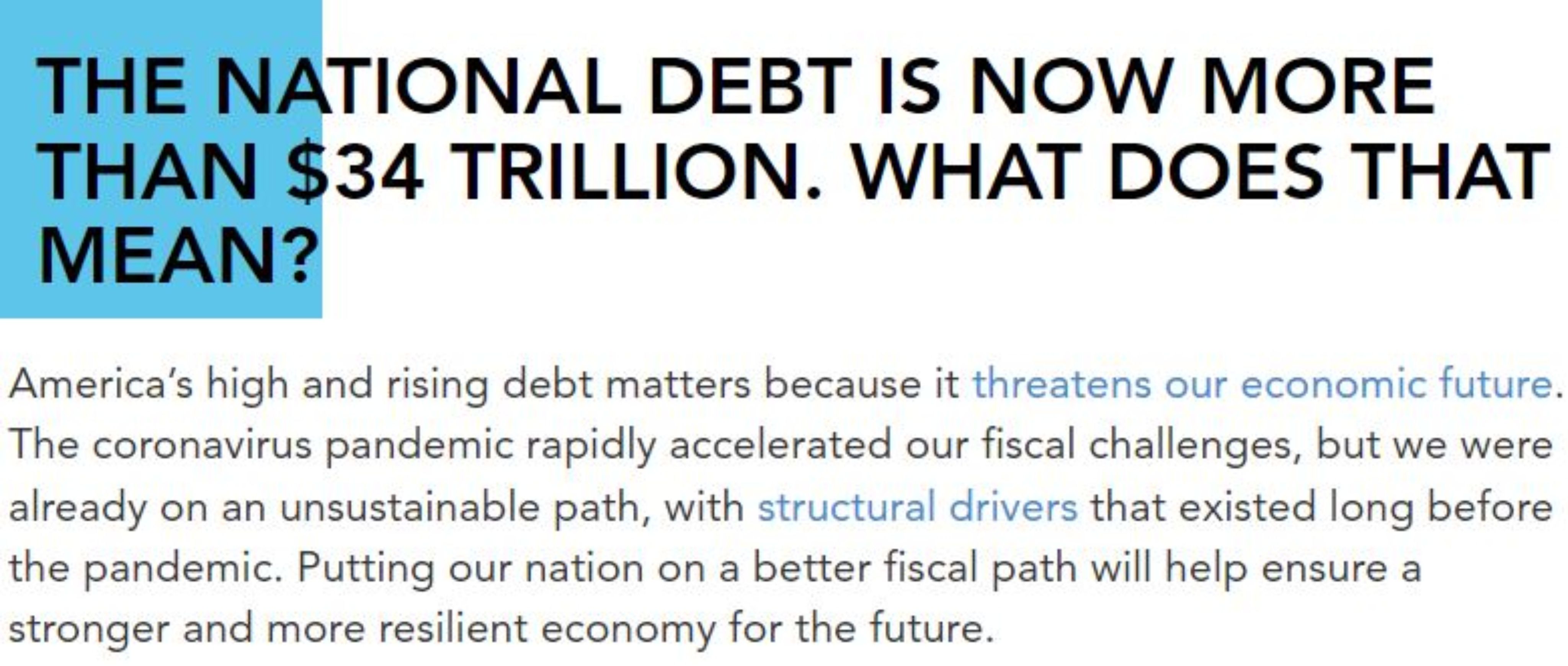 按照美國(guó)獨(dú)立權(quán)威經(jīng)濟(jì)研究智庫(kù)——彼得森基金會(huì)的說(shuō)法,規(guī)模龐大且不斷增加的債務(wù)“正威脅著美國(guó)的經(jīng)濟(jì)未來(lái)”,因?yàn)樵缇痛嬖诘摹敖Y(jié)構(gòu)性驅(qū)動(dòng)因素”已經(jīng)讓美國(guó)財(cái)政政策走上了一條“不可持續(xù)的道路”。