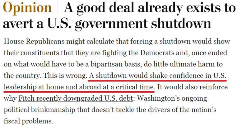 有美媒評(píng)論指出,政府關(guān)門(mén)將動(dòng)搖國(guó)內(nèi)外對(duì)美國(guó)領(lǐng)導(dǎo)層的信心,而這也將進(jìn)一步坐實(shí)國(guó)際評(píng)級(jí)機(jī)構(gòu)對(duì)美國(guó)信用“降級(jí)”的原因:華盛頓持續(xù)的政治脅迫政策無(wú)法解決日益惡化的財(cái)政問(wèn)題。
