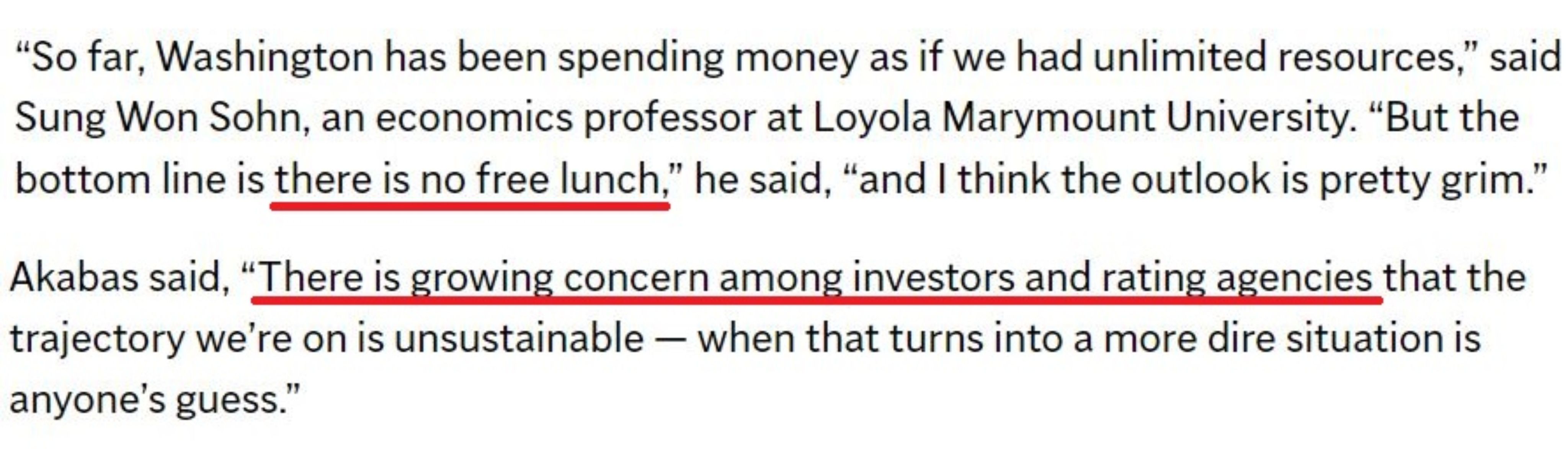 用洛杉磯洛約拉馬利蒙特大學(xué)經(jīng)濟(jì)專(zhuān)家的話(huà)說(shuō),“到目前為止,華盛頓一直在花錢(qián),好像我們擁有無(wú)限的資源,但天下終究沒(méi)有免費(fèi)的午餐”。