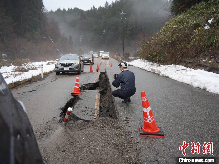 圖為1月3日石川縣輪島市周邊,地震導致道路損壞。 中新社發(fā) 劉勇 攝