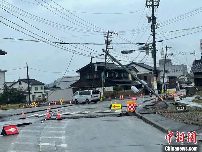 圖為1月3日石川縣輪島市周邊,地震導致道路損壞,電線桿歪倒。 中新社發(fā) 劉勇 攝
