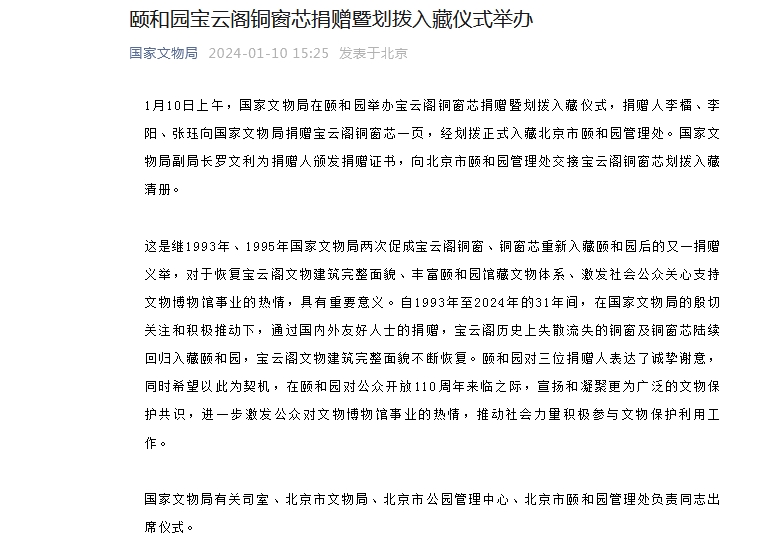 這是繼1993年、1995年國家文物局兩次促成寶云閣銅窗、銅窗芯重新入藏頤和園后的又一捐贈義舉,對于恢復(fù)寶云閣文物建筑完整面貌、豐富頤和園館藏文物體系、激發(fā)社會公眾關(guān)心支持文物博物館事業(yè)的熱情,具有重要意義。自1993年至2024年的31年間,在國家文物局的殷切關(guān)注和積極推動下,通過國內(nèi)外友好人士的捐贈,寶云閣歷史上失散流失的銅窗及銅窗芯陸續(xù)回歸入藏頤和園,寶云閣文物建筑完整面貌不斷恢復(fù)。頤和園對三位捐贈人表達(dá)了誠摯謝意,同時希望以此為契機,在頤和園對公眾開放110周年來臨之際,宣揚和凝聚更為廣泛的文物保護(hù)共識,進(jìn)一步激發(fā)公眾對文物博物館事業(yè)的熱情,推動社會力量積極參與文物保護(hù)利用工作。