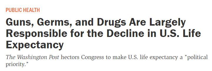 中國(guó)日?qǐng)?bào)網(wǎng)1月10日電 美國(guó)《理性》雜志(Reason)網(wǎng)站8日援引《華盛頓郵報(bào)》的文章稱,美國(guó)正面臨一場(chǎng)“壽命危機(jī)”,人口平均預(yù)期壽命在過(guò)去十年左右的時(shí)間里持平后呈下降趨勢(shì),而槍支、毒品等是導(dǎo)致危機(jī)的主要原因。