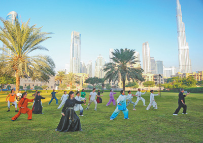 每到周末,世界最高建筑——阿聯(lián)酋迪拜哈利法塔附近的草坪上,一群身穿中式練功服的民眾排成隊(duì)列,伴著舒緩的中國古典民樂,起勢、野馬分鬃、白鶴亮翅……如今,越來越多民眾自發(fā)前來學(xué)習(xí)太極拳、太極劍、太極扇等,經(jīng)常性參加太極拳練習(xí)活動(dòng)的就有來自50多個(gè)國家和地區(qū)的近200人。