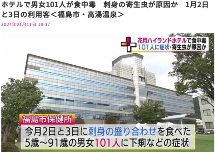 報道稱,中毒者年齡下至5歲,上至91歲。保健所在調查中發(fā)現該酒店提供的魚類刺身上檢測出寄生蟲,并認為這就是導致此次食物中毒的原因。