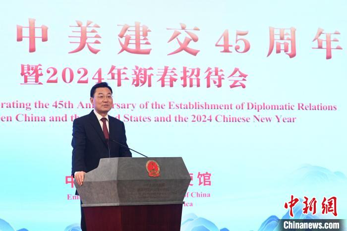 當地時間1月16日,中國駐美大使謝鋒在華盛頓舉辦的紀念中美建交45周年暨新春招待會上致辭。中新社記者 陳孟統(tǒng) 攝