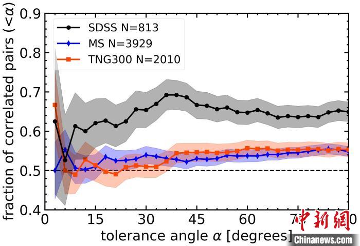 同向運(yùn)動(dòng)衛(wèi)星星系對占比隨張角的變化:黑色帶圓點(diǎn)的實(shí)線為觀測結(jié)果,藍(lán)線和紅線為理論模擬預(yù)測結(jié)果,黑色虛線為隨機(jī)分布,陰影區(qū)為自舉標(biāo)準(zhǔn)誤差范圍。中國科學(xué)院國家天文臺(tái)/供圖