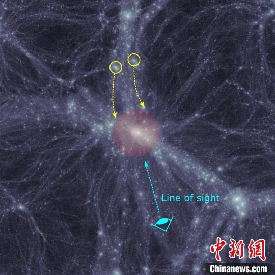 往大質(zhì)量星系群中掉落的星系(圖片來源:廖世鴻),紅色區(qū)域?yàn)橐粋€(gè)大質(zhì)量星系群,黃色圓圈里的為正沿著大尺度纖維狀結(jié)構(gòu)掉落的星系,它們相對于中央星系沿相同方向運(yùn)動(dòng)。中國科學(xué)院國家天文臺(tái)/供圖
